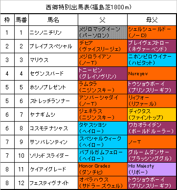 昨年の3回福島開幕週の好走血統を参考に予想させていただきます。昨年の開幕週、芝ではノーザンダンサー系(大系統)が好調で、なかでもノーザンテースト系・ニジンスキー系・リファール系が良かったとのこと。そしてこれは昨年の3回福島開幕週の好走血統の本文中には書かなかったのですが、芝1800mに限るとニジンスキー系がもっとも活躍していました。西郷特別出走馬で父ニジンスキー系となるのはホシノプレゼント・ヤナギムシ。◎はホシノプレゼント、○ヤナギムシ。