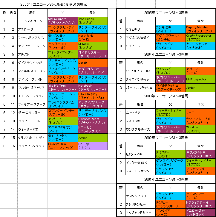 ■【ユニコーンS】近5年の傾向(出馬表から):父か母父がミスプロ系という馬が4年連続で連対。サンデーサイレンス系種牡馬(ヘイロー系)の産駒が活躍。ノーザンダンサー系(大系統)も毎年2頭近く好走馬を出している。