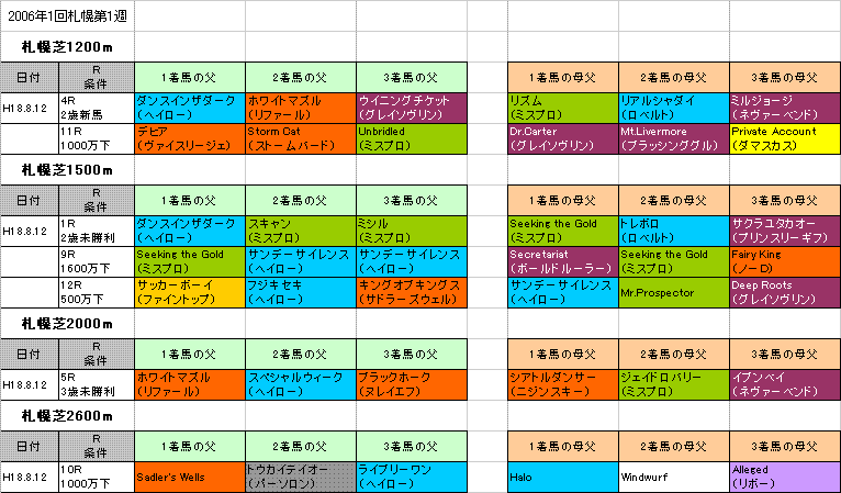 ■8月12日土曜札幌開催芝コースの結果(表):サドラーズウェルズ系・リファール系、グレイソヴリン系などは好調そう。父サンデーサイレンス系(ヘイロー系)×母父ミスプロ系という馬の好走が多かった。