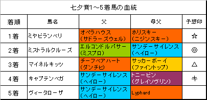2006年のような時計の速い七夕賞でしたね。2006年はミスプロの血を持つ馬が上位に来たように、今年もミスプロ系ミストラルクルーズが2着でした。