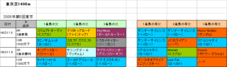 左は今東京開催芝1400mの1〜3着馬の血統です。こちらから