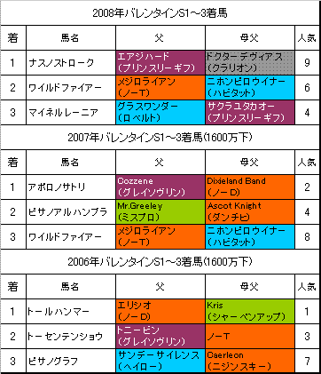 【バレンタインS】過去3年の傾向(表):得意の東京芝1400mでナスルーラ系(大系統)が活躍。ノーザンテースト系も毎年好走。