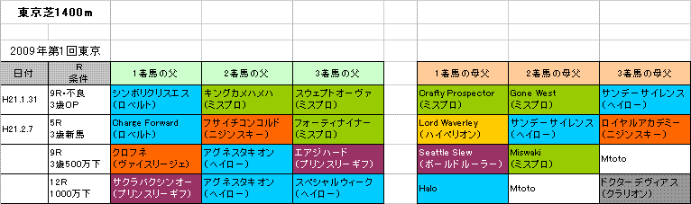 東京芝1400mの傾向(表):先週はパワー型血統の馬も勝っていたが、プリンスリーギフト系などのスピード血統もやはり良い。