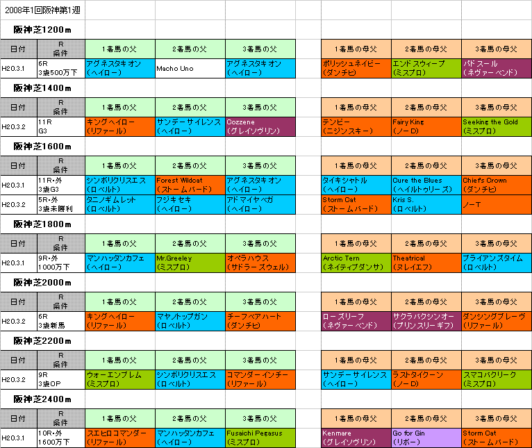 昨年の同開催開幕週の結果をまとめました。【アーリントンC】阪神芝・外1600mと【阪急杯】阪神芝1400mの参考にもなります。「系統色分け表」はこちらです。