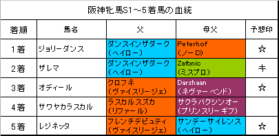 それでも予想記事で書いた阪神芝1400m重賞の基本的な攻め方は、やはりここでも通用。今回はスタミナ型血統の差し馬。ジョリーダンスは一昨年も勝っているので適性面で言うことはありませんでしたが、近2走の評価を下げすぎたのが悪かった。牡馬相手で、あの間に入ってこれる馬がここにそんなにいるかということですよね。ザレマは前目の脚質の馬なので、血統と脚質のバランスが悪いとしてしまいましたが、短縮ということをもっと意識していれば、今回のような好位差しのイメージもできたかも。