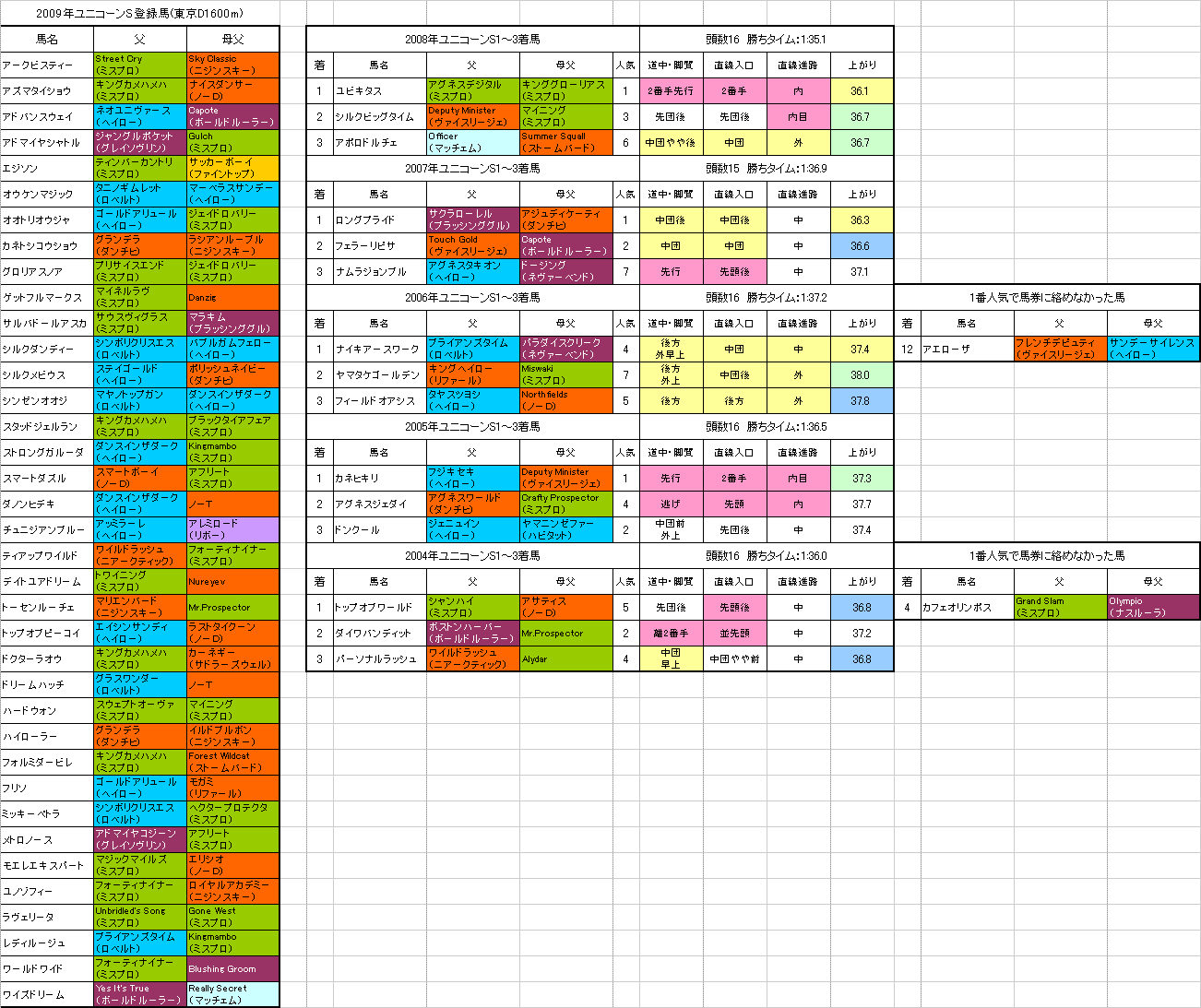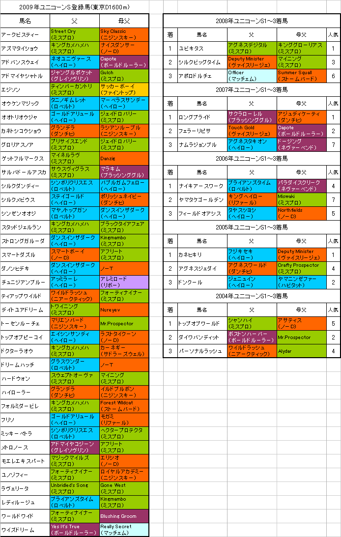 6月6日に行われる【ユニコーンS】東京D1600mの登録馬と過去5年の1〜3着馬の血統はこちらの表のようになっております。「携帯用過去5年の血統傾向表」はこちらです。