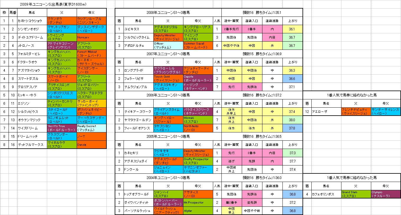 左は【ユニコーンS】東京D1600mの出馬表と各馬の血統、過去5年の1〜3着馬の血統です。(クリックすると大きな画像で見ることができます。)「携帯用過去5年の血統傾向表」はこちらです。【ユニコーンS】の予想を書かせていただきます。☆【ユニコーンS】登録馬の血統