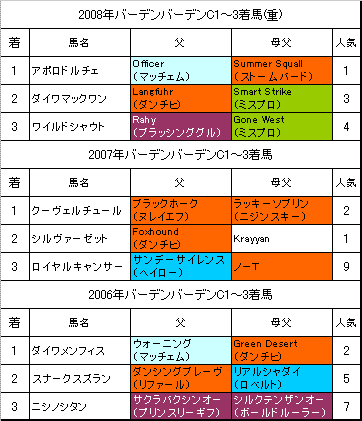 6月28日に行われる【バーデンバーデンC】福島芝1200mの過去3年の1〜3着馬の血統はこちらの表のようになっております。「系統色分け表」はこちらです。