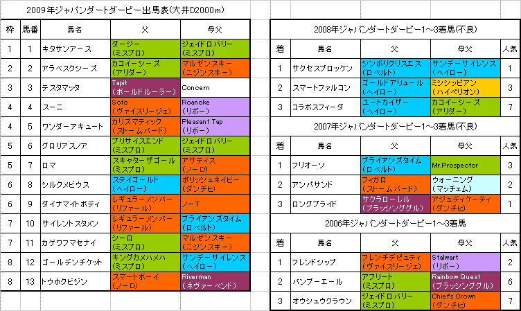 左は【ジャパンダートダービー】大井D2000mの出馬表と各馬の血統、過去3年の1〜3着馬の血統です。(クリックすると大きな画像で見ることができます。)「系統色分け表」はこちらです。【ジャパンダートダービー】の予想を書かせていただきます。ジャパンダートダービー(JpnI) |