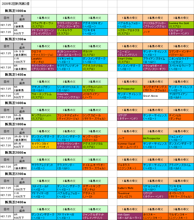先週の新潟芝外回りコース:スタミナ(万能型)血統が中心も、1600mはちょっとダートっぽい血統が走っていた。