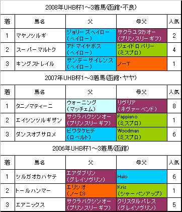 左は【UHB杯】札幌芝1200mの過去3年の1〜3着馬の血統です。(クリックすると大きな画像で見ることができます。)「系統色分け表」はこちらです。【UHB杯】の予想を書かせていただきます。【UHB杯】の系統色分け出馬表