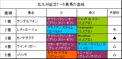 左は【北九州記念】小倉芝1200m1〜5着馬の血統です。こちらをみながら【北九州記念】を振り返ります。【北九州記念】の予想はこちらでした。