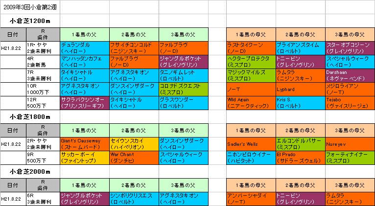 土曜日の小倉芝中距離ではノーザンダンサー系(大系統)が良く、そのなかでもサドラーズウェルズ系の活躍が目立った。