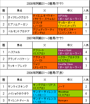 8月30日に行われる【阿蘇S】小倉D1700mの過去3年の1〜3着馬の血統はこちらの表のようになっております。「系統色分け表」はこちらです。