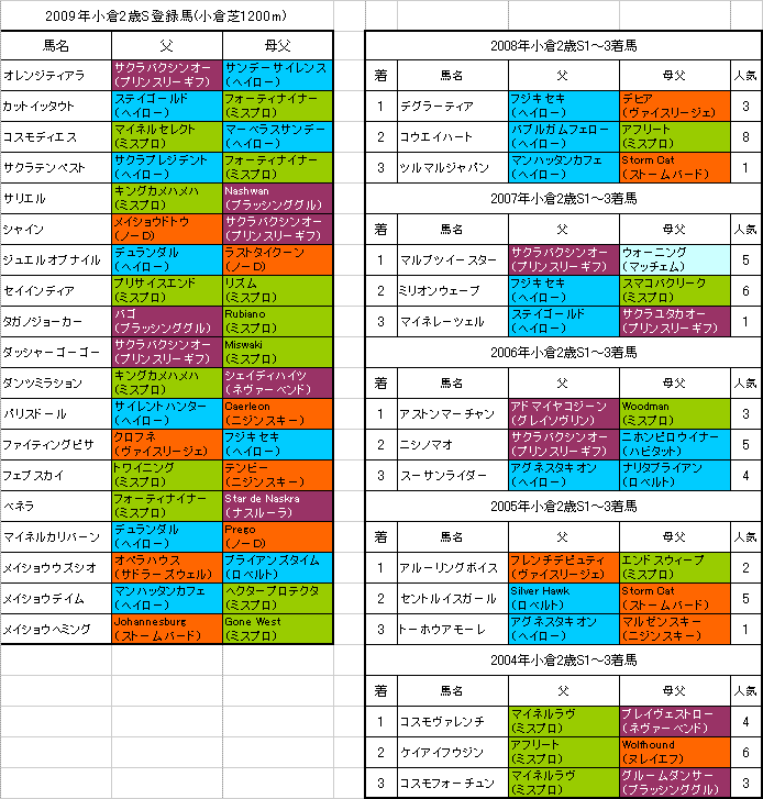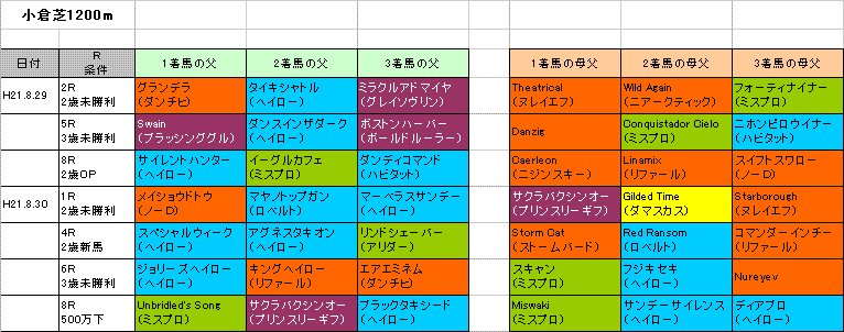左は先週の小倉開催芝1200mの1〜3着馬の血統です。こちらから【小倉2歳S】小倉芝1200mの注目馬を探します。