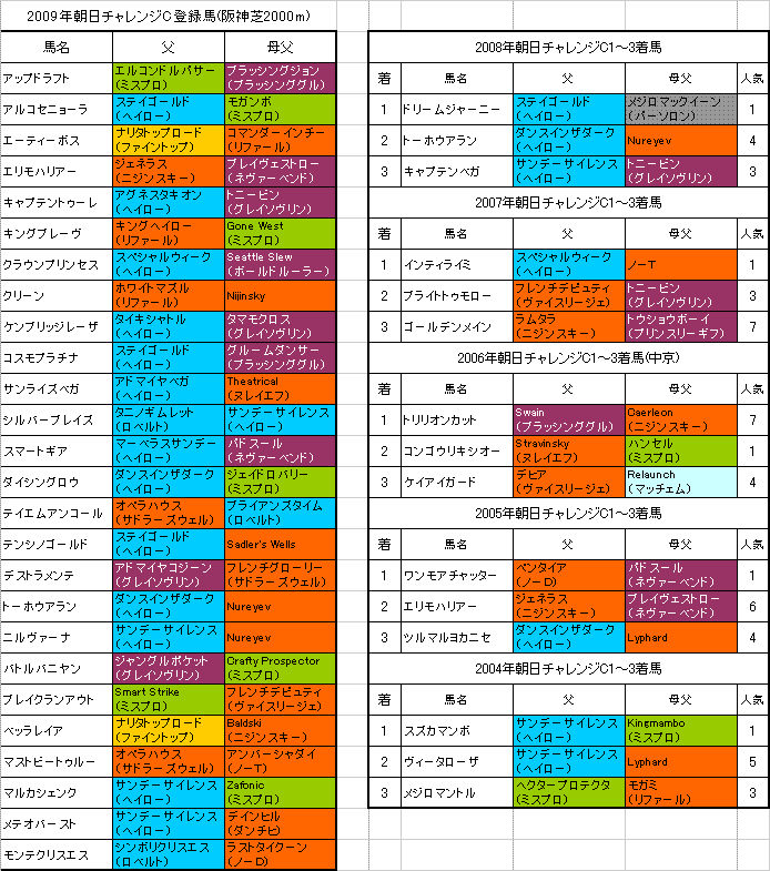 9月12日に行われる【朝日チャレンジC】阪神芝2000mの登録馬と過去5年の1〜3着馬の血統はこちらの表のようになっております。「系統色分け表」はこちらです。