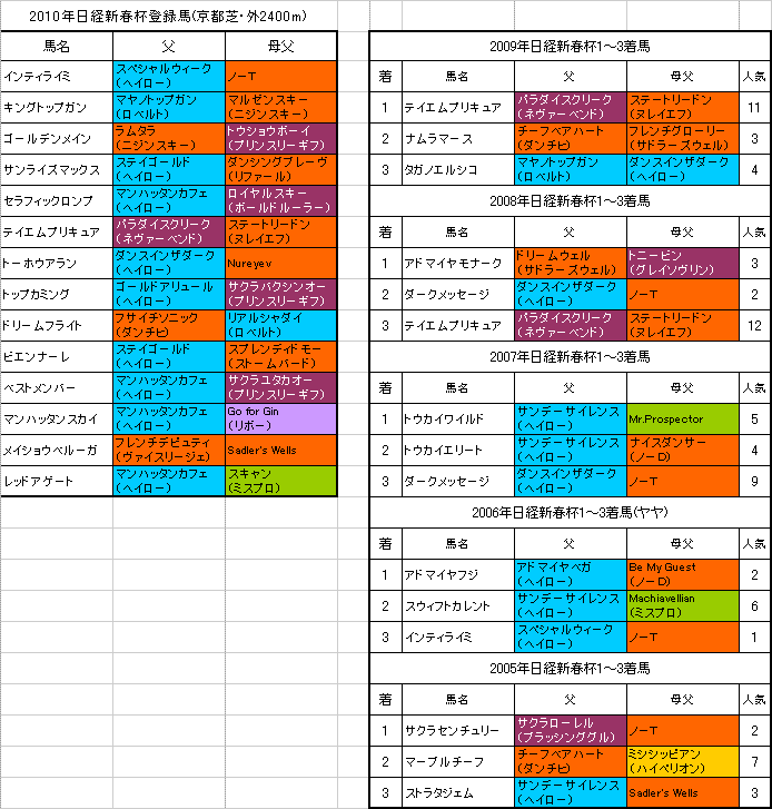1月17日に行われる【日経新春杯】京都芝・外2400mの登録馬と過去5年の1〜3着馬の血統はこちらの表のようになっております。「系統色分け表」はこちらです。