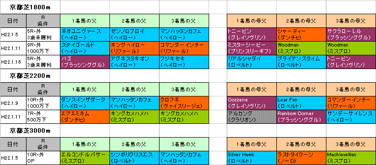 ○は父フサイチソニック(ダンチヒ系)×母父リアルシャダイ(ロベルト系)のドリームフライト。ダンチヒ系の中でもフサイチソニックと同じデインヒル系のエアエミネム産駒が2200mで勝っていますし、土曜日の芝1800mで母父リアルシャダイが1着。