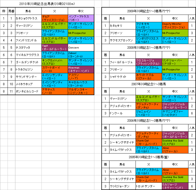 左は【川崎記念】川崎D2100mの出馬表と各馬の血統、過去5年の1〜3着馬の血統です。(クリックすると大きな画像で見ることができます。)「系統色分け表」はこちらです。【川崎記念】の予想を書かせていただきます。| トラコミュ 川崎記念(JpnI) |