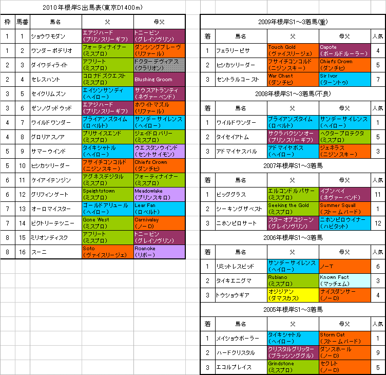 左は【根岸S】東京D1400mの出馬表と各馬の血統、過去5年の1〜3着馬の血統です。(クリックすると大きな画像で見ることができます。)【根岸S】の予想を書かせていただきます。☆【根岸S】登録馬の血統