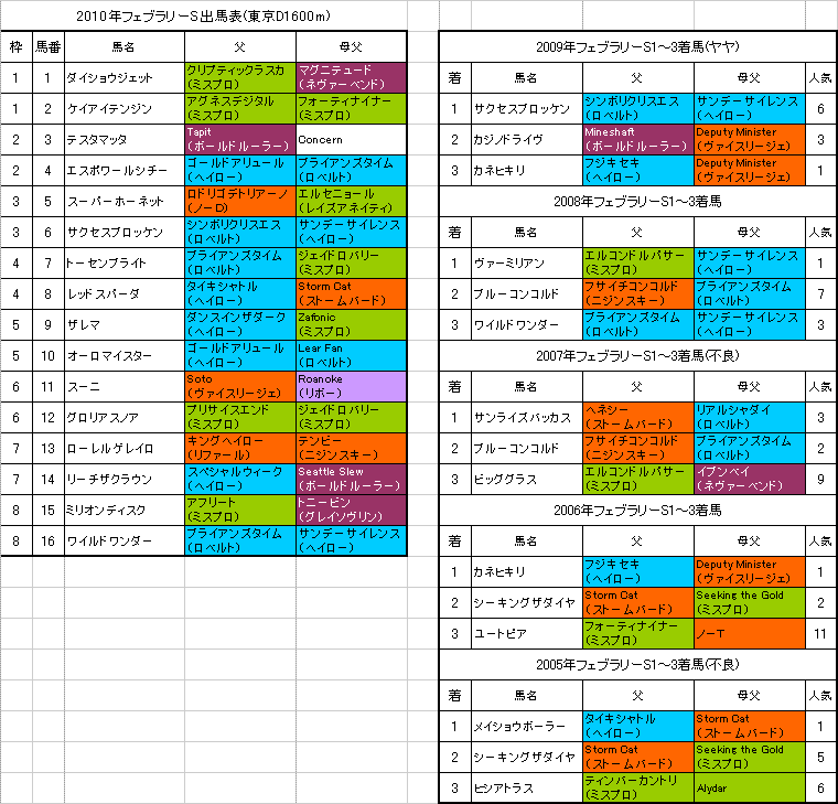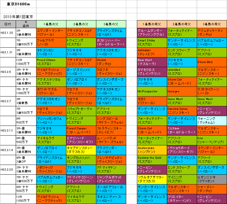 ◎は父・母父ともにパワー型ターントゥ系(大系統)のエスポワールシチー。せっかく年初にやった2010年G1勝ち馬予想で挙げた馬が出てきてくれたので。さっそくやばいことになっている馬もいますが^^;