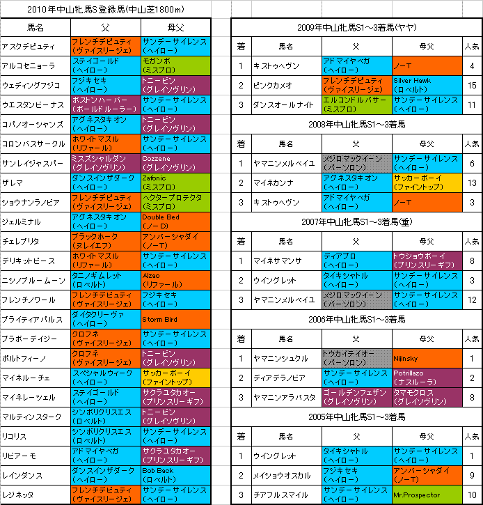 3月14日に行われる【中山牝馬S】中山芝1800mの登録馬と過去5年の1〜3着馬の血統はこちらの表のようになっております。「系統色分け表」はこちらです。