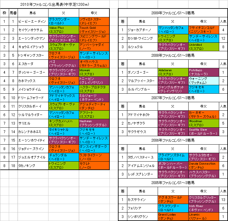 左は【ファルコンS】中京芝1200mの出馬表と各馬の血統、過去5年の1〜3着馬の血統です。(クリックすると大きな画像で見ることができます。)【ファルコンS】の予想を書かせていただきます。☆【ファルコンS】登録馬の血統