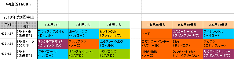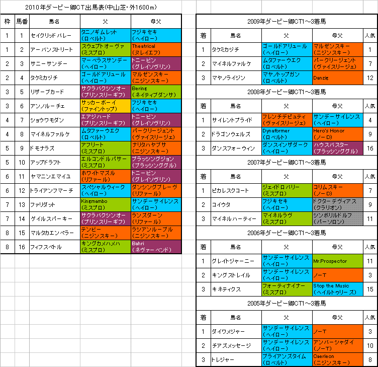 左は【ダービー卿CT】中山芝・外1600mの出馬表と各馬の血統、過去5年の1〜3着馬の血統です。(クリックすると大きな画像で見ることができます。)【ダービー卿CT】の予想を書かせていただきます。☆【ダービー卿CT】登録馬の血統