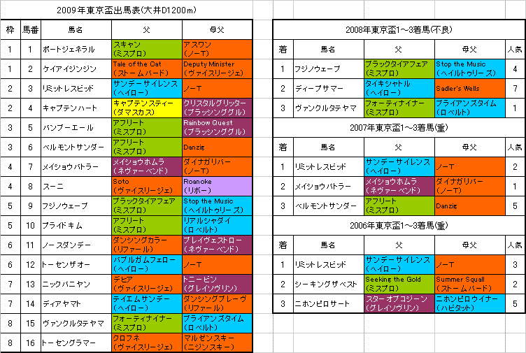 左は【東京盃】大井D1200mの出馬表と各馬の血統、過去3年の1〜3着馬の血統です。(クリックすると大きな画像で見ることができます。)「系統色分け表」はこちらです。【東京盃】の予想を書かせていただきます。続きを読む