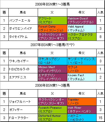 9月5日に行われる【BSN賞】新潟D1200mの過去3年の1〜3着馬の血統はこちらの表のようになっております。「系統色分け表」はこちらです。