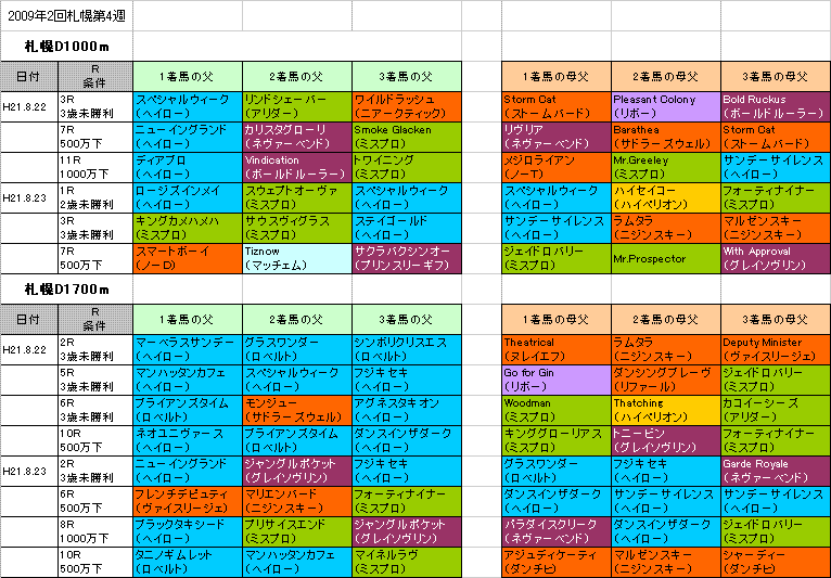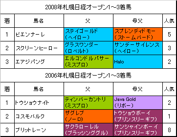 9月6日に行われる【札幌日経オープン】札幌芝2600mの過去2回の1〜3着馬の血統はこちらの表のようになっております。「系統色分け表」はこちらです。