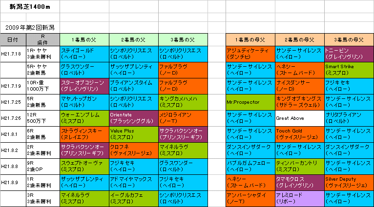 今新潟開催芝1400m:1着馬10頭中9頭は父か母父がターントゥ系(大系統)となっている。特に母父サンデーサイレンス(ヘイロー系)が活躍。