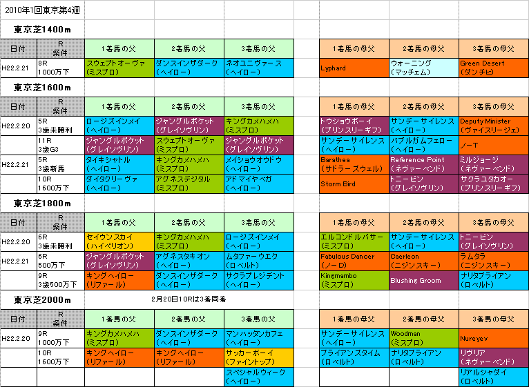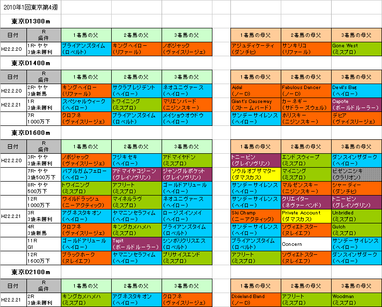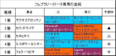 2月21日に行われる【フェブラリーS】東京D1600mの登録馬と過去5年の1〜3着馬の血統はこちらの表のようになっております。「系統色分け表」はこちらです。