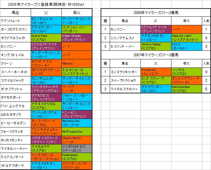 4月17日に行われる【マイラーズC】阪神芝・外1600mの登録馬と過去3年の1〜3着馬の血統はこちらの表のようになっております。「系統色分け表」はこちらです。