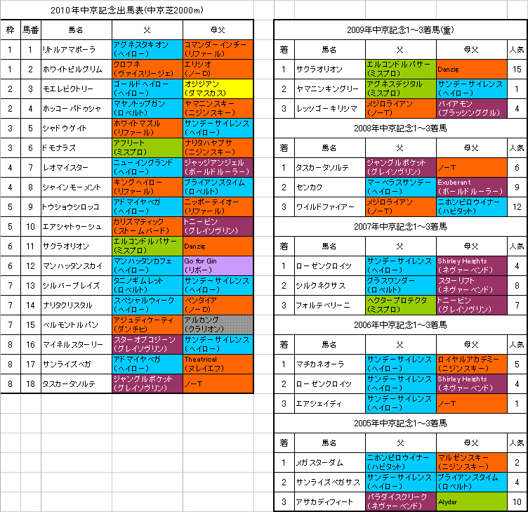 3月13日に行われる【中京記念】中京芝2000mの登録馬と過去5年の1〜3着馬の血統はこちらの表のようになっております。「系統色分け表」はこちらです。