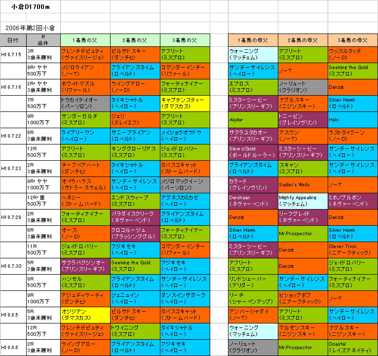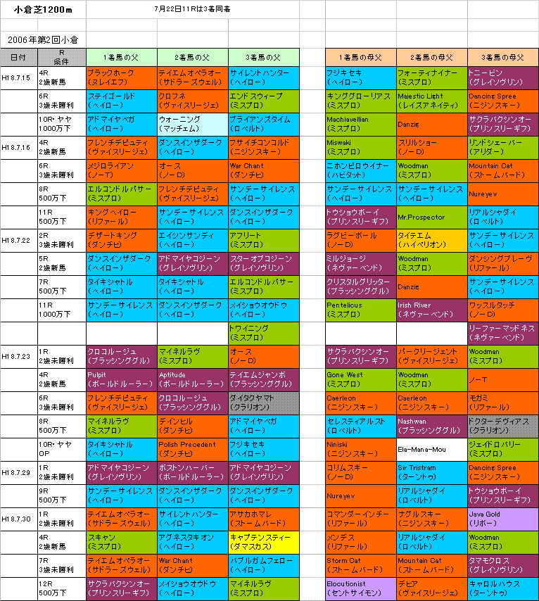 今小倉開催芝1800m(表)は先週までの母父ナスルーラ系(大系統)旋風も一段落。安定して良さそうなのはリファール系か(メイショウオウドウの母父もリファール)。
