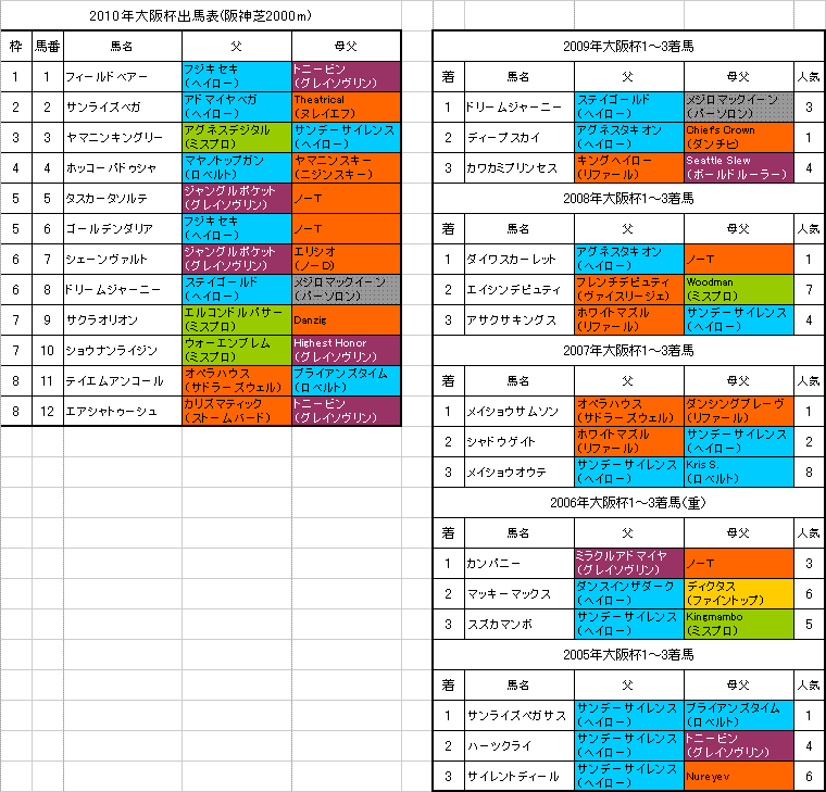 4月4日に行われる【大阪杯】阪神芝2000mの登録馬と過去5年の1〜3着馬の血統はこちらの表のようになっております。「系統色分け表」はこちらです。