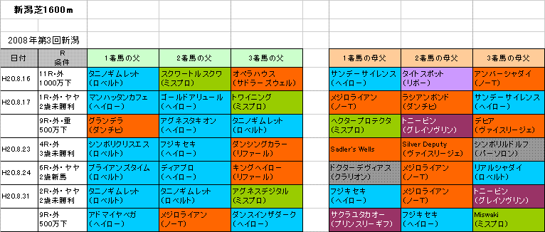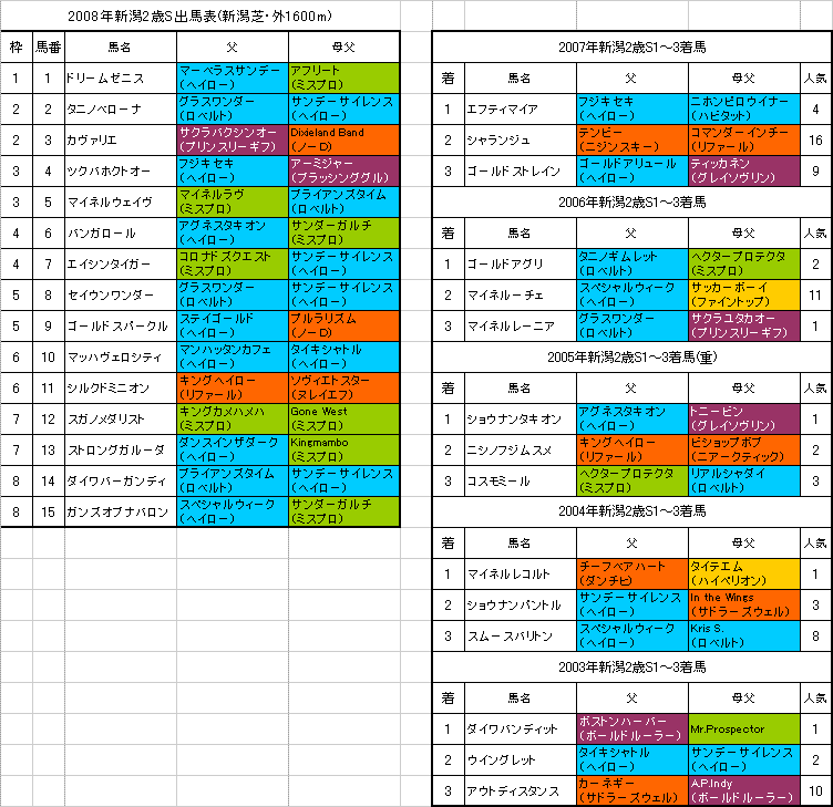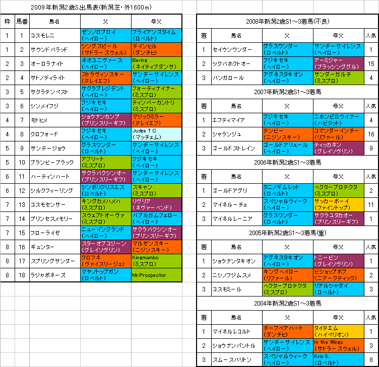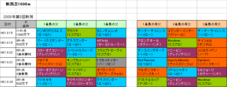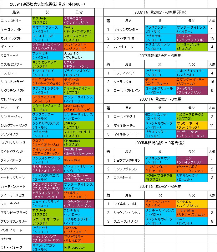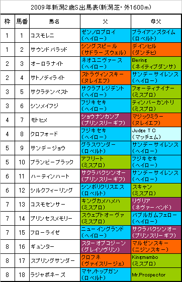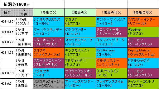【新潟2歳S】新潟芝・外1600mの1〜5着の血統は左の表のようになっております。第29回 新潟2歳ステークス(JpnIII) |