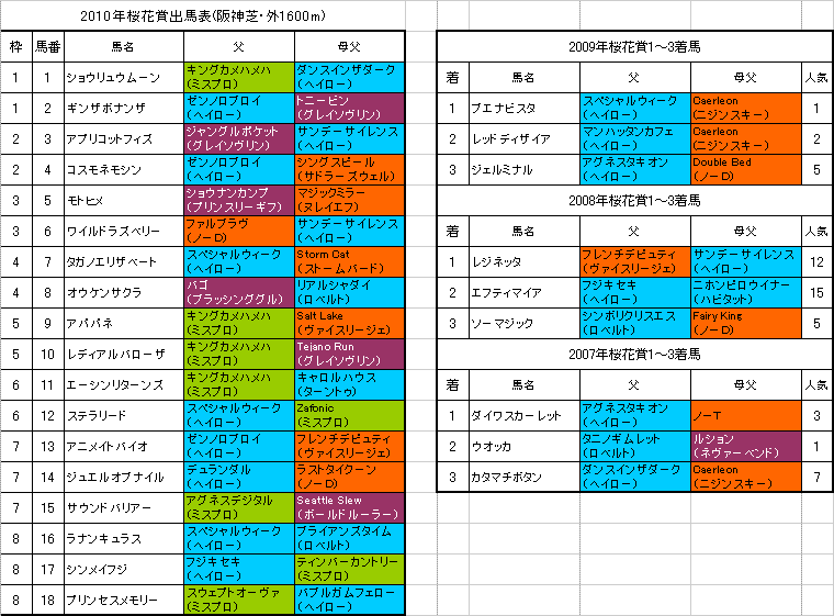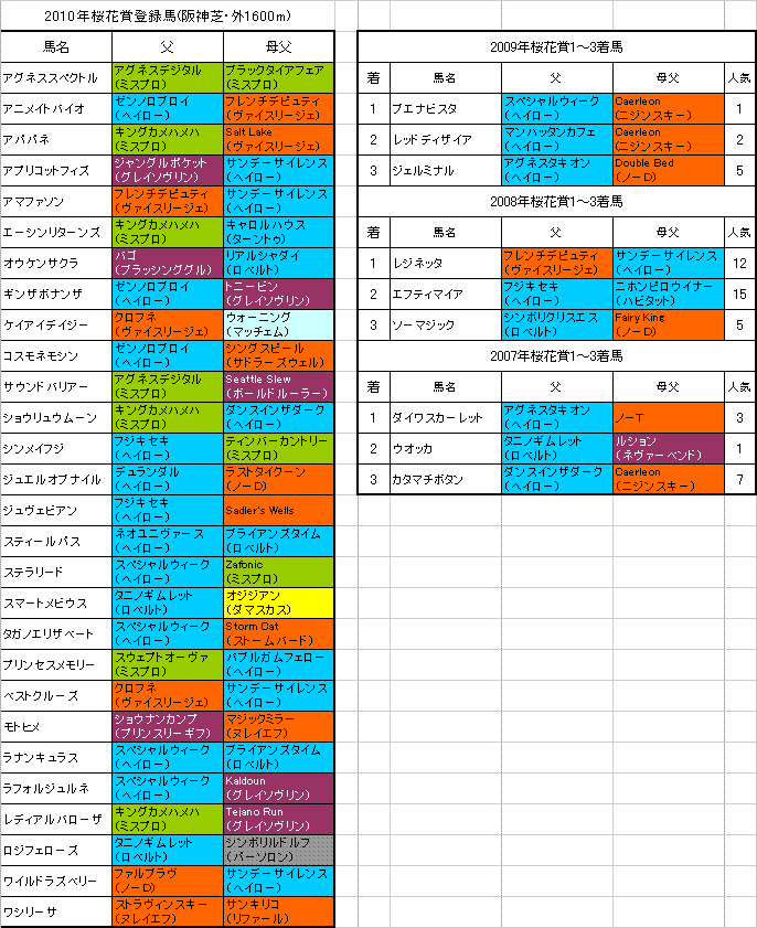 4月11日に行われる【桜花賞】阪神芝・外1600mの登録馬と過去3年の1〜3着馬の血統はこちらの表のようになっております。「系統色分け表」はこちらです。
