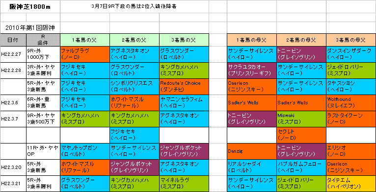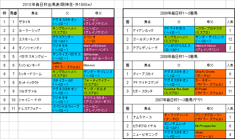 3月27日に行われる【毎日杯】阪神芝・外1800mの登録馬と過去3年の1〜3着馬の血統はこちらの表のようになっております。「系統色分け表」はこちらです。